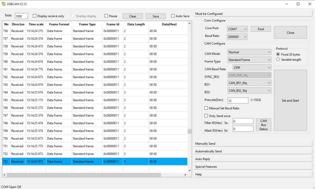 Po skonfigurowaniu Mikrokontrolera 2 zgodnie z powyższym opisem wykonałem taki sam test. Mikrokontroler 1 wysyła periodycznie ramki watchdog o ID 0x11, a po naciśnięciu przycisku wysyłane są ramki o ID 0x12. Tak samo jak w Przypadku 1 wprowadziłem do programu USBCAN filtr na ID 0x12.