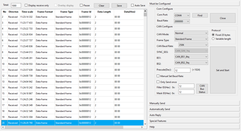 Analizator CAN pokazuje 20 wysłanych ramek ID 0x12.