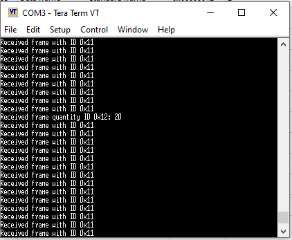 Poniżej znajduje się terminal, który informuje o ramkach odebranych przez Mikrokontroler 2. Jak widać Mikrokontroler 2 odebrał wszystkie 20 ramek o ID 0x12.