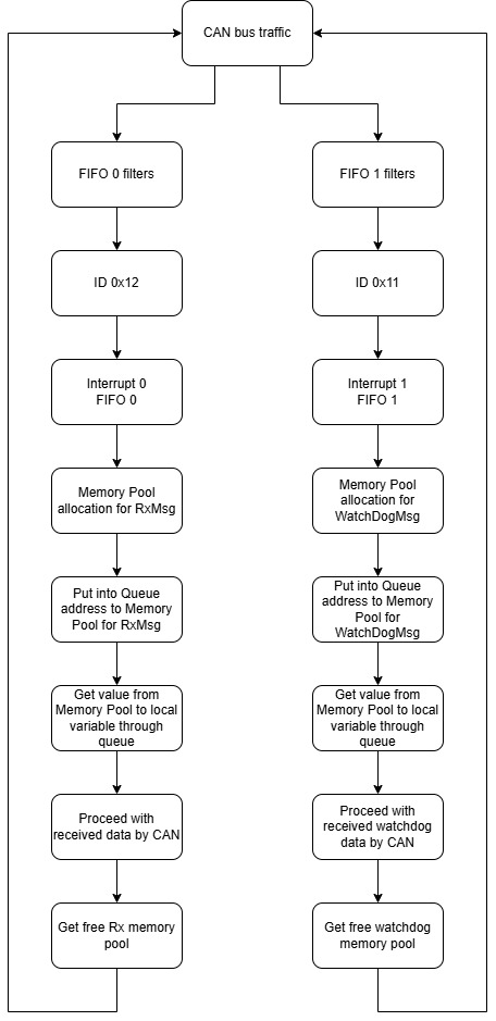 To najprostszy model odbioru danych: przerwanie odbioru CAN zapisuje dane do statycznego bufora (np. tablica struktur), a następnie dane są pobierane w kolejności FIFO.
