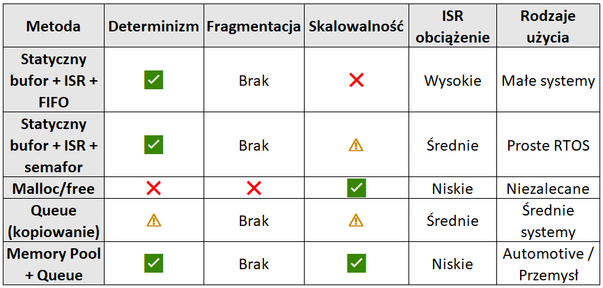 5. Memory Pool (najlepsza metoda w RTOS) to wcześniej przygotowana pula identycznych bloków pamięci, z których system może szybko „wypożyczać” i „oddawać” elementy. Wyobraź sobie, że zamiast dynamicznie budować pamięć za każdym razem (malloc), przygotowujesz na starcie. Potem tylko: bierzesz jeden wolny blok, używasz go, oddajesz go do puli. Bez dzielenia sterty, bez szukania miejsca w pamięci, bez fragmentacji.