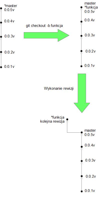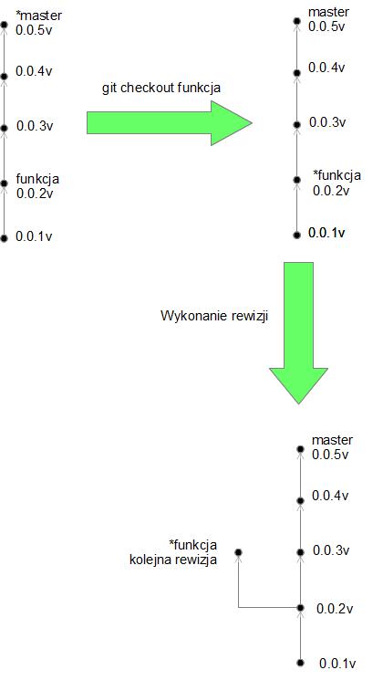 Jeśli chcemy stworzyć nową gałąź, przełączyć ją oraz wybrać inną rewizję dla nowej gałęzi to zrealizujemy to poleceniem: