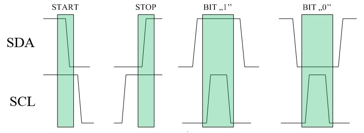 Transmisja danych jest inicjalizowana przez urządzenie pracujące w trybie master. Sekwencja rozpoczęcia komunikacji polega na zmianie stanu linii SDA z wysokiego na niski w momencie, kiedy linia SCL jest ustawiona w stan wysoki. Zakończenie transmisji działa na podobnej zasadzie. Linia SCL musi być ustawiona w stan wysoki, lecz stan linii SDA jest zmieniany z niskiego na wysoki. Logiczna „1” występuje w przypadku kiedy linia SDA ma stan wysoki, a linia SCL w tym czasie zmieni swój stan z niskiego na wysoki oraz z wysokiego na niski. Logiczne „0” występuje w przypadku kiedy linia SDA ma stan niski, a linia SCL w tym czasie zmieni swój stan z niskiego na wysoki oraz z wysokiego na niski. Opisane stany przedstawiłem graficznie na poniższym rysunku.