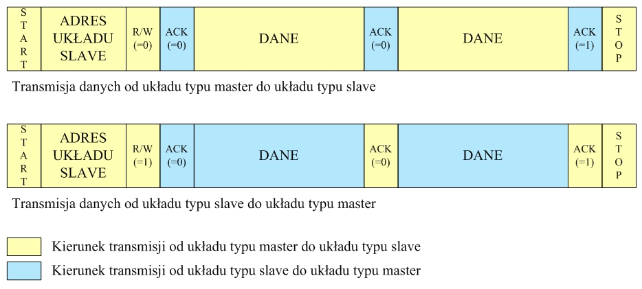 Długość ramki danych wynosi 8 bitów. Po odebraniu bajtu układ odbiornika wysyła potwierdzenie (ACK). Transmisja danych nie musi zakończyć się po wysłaniu jednego bajtu, lecz może być cały czas kontynuowana, aż do momentu zakończenia transmisji przez układ master. Podczas wymiany informacji transmisja może zostać wstrzymana, poprzez ustawienie linii SCL w stan niski. Ponowne wznowienie komunikacji polega na wznowieniu sygnału zegarowego. Tak jak wspomniano wcześniej, urządzenia posiadają swój własny adres, który jest generowany na linii SDA tuż po pojawianiu się sygnału rozpoczęcia transmisji. Adresy urządzeń interfejsu I2C składają się z 7 bitów. Po nadaniu adresu, ósmym bitem jest informacja, czy układ slave ma odbierać (stan niski linii SDA), czy nadawać (stan wysoki linii SDA). Typowe ramki danych interfejsu I2C zamieściłem poniżej.
