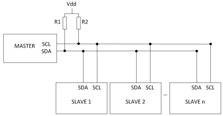 Połącznie interfejsu I2C realizowane jest przez dwie linie sygnałowe: SDA odpowiadająca za przesyłanie danych, a SCL odpowiadająca za taktowanie zegarowe. Obydwie linie mają charakter otwartego kolektora, dlatego w celu poprawnej komunikacji, należy połączyć je z napięciem zasilania rezystorami (R1 i R2) o wartościach w celu osiągnięcia na liniach odpowiedniego poziomu napięcia. Do magistrali można teoretycznie podłączyć nieograniczoną liczbę urządzeń, jednakże należy pamiętać, że pasożytnicza sumaryczna pojemność nie może zostać przekroczona, w przeciwnym razie nie będzie możliwe korzystanie z maksymalnej szybkości wymiany informacji. Układy mają możliwość działania w jednym z dwóch trybów mistrz, bądź niewolnik. Mistrz i niewolnik w ogólnie przyjętej nomenklaturze związanej z interfejsami komunikacyjnymi noszą nazwy master i slave, dlatego w dalszej części wpisu będę posługiwał się tymi wyrazami. Układy typu master przejmują kontrolę nad magistralą, zarządzając transmisją danych, czyli inicjalizują połączenie, kończą je oraz ustalają taktowanie. Układy typu slave są wybierane przez mastera. Warto zaznaczyć, że do magistrali I2C można dołączyć kilka układów typu master oraz slave. W czasie wymiany informacji tylko jeden układ master jest aktywny, lecz w przypadku, kiedy w tym samym czasie oba takie układy rozpoczną nadawanie, dostęp rozstrzygany jest na zasadzie arbitrażu. Typowe połączenie urządzeń z interfejsem I2C przedstawiłem na poniższym rysunku.
