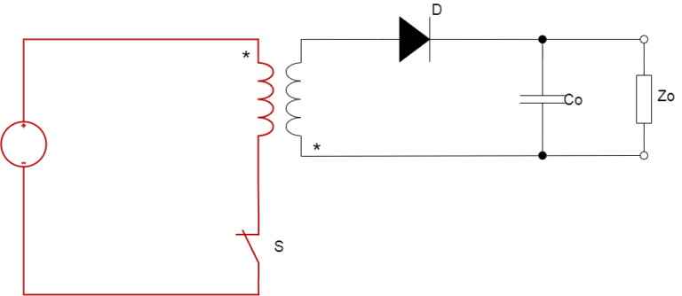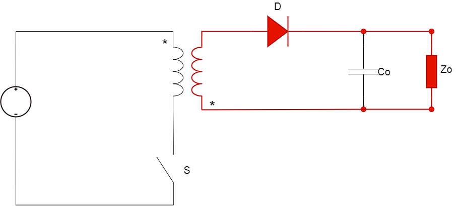 Przetwornica flyback działa w dwóch taktach, pierwszy z nich występuje w momencie załączenia tranzystora. Energia pobierana jest ze źródła i magazynowana w transformatorze. Dioda wyjściowa jest spolaryzowana w kierunku zaporowym, a energia do obciążenia pobierana jest z kondensatora wyjściowego.