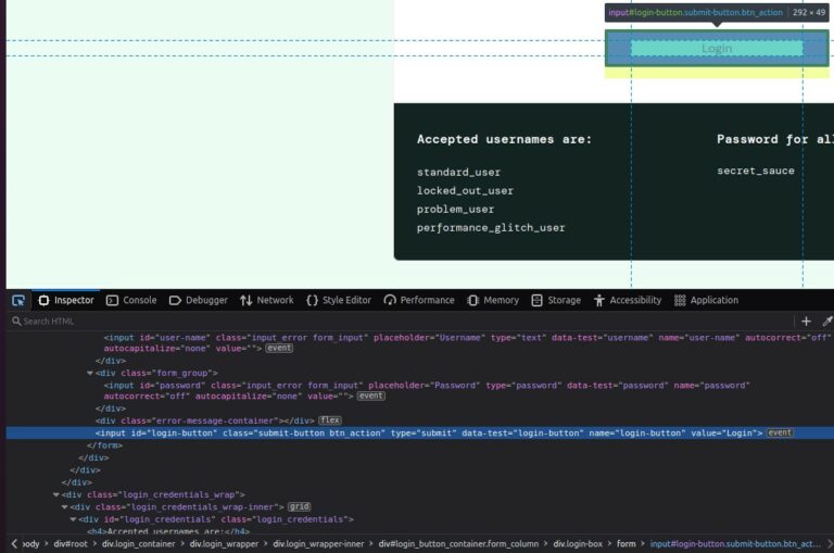 Podobnie jak w poprzednim wpisie, aby odnaleźć element na stronie, możemy skorzystać z narzędzi developerskich, które są wbudowane w popularne przeglądarki internetowe. Uruchomienie narzędzi deweloperskich zrealizujemy poprzez naciśnięcie przycisku F12. Żeby zobaczyć kod strony, należy wybrać zakładkę „Inspector„, natomiast żeby szybko zlokalizować szukany element w kodzie, możemy skorzystać z narzędzia „Inspect” (przeważnie widocznego w postaci ikonki ze strzałką). Dzięki tej funkcjonalności wystarczy, że najedziemy na interesujący nas element, a w sekcji z kodem zostanie znaleziona i podświetlona linijka odpowiedzialna za ten element.