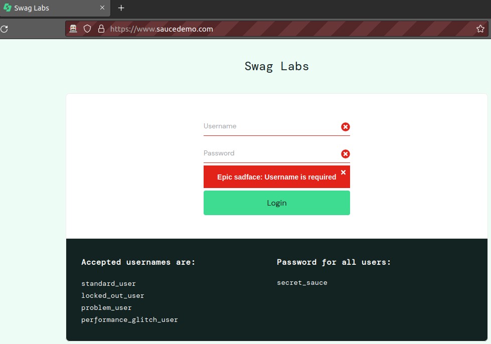 Podczas wykonywania skryptu, powinniśmy w przeglądarce ujrzeć efekt naciśnięcia przycisku login bez wprowadzenia danych do logowania, czyli loginu i hasła. Strona w takim przypadku powinna zwrócić nam stosowny komunikat, informujący nas, że jednak czegoś brakuje lub czegoś nie zrobiliśmy.