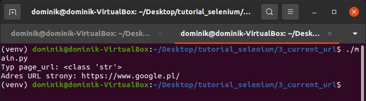 Po wykonaniu skryptu powinniśmy zobaczyć w terminalu typ zmiennej current_url oraz aktualny adrers url strony.
