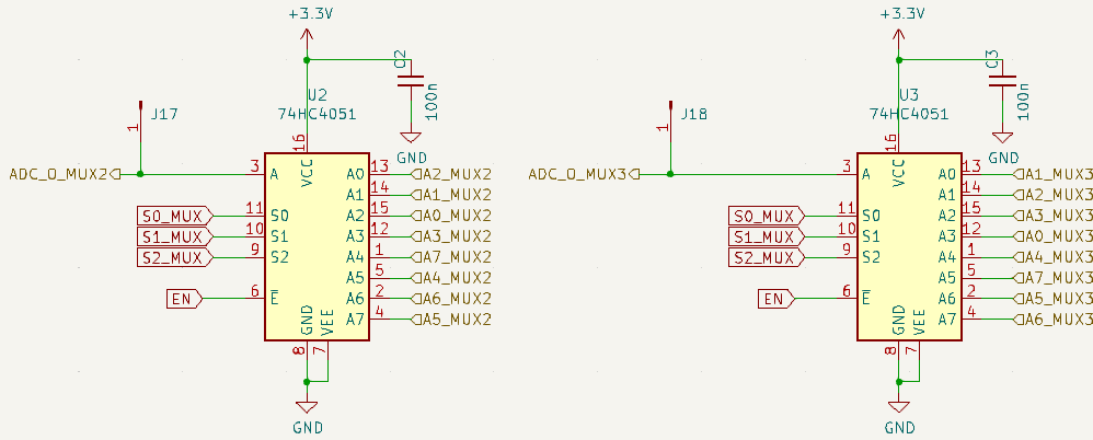 - Brak rezystorów szeregowych na wyjściach MUX, które tworzyłyby filtr dolnoprzepustowy wraz z kondensatorami filtrującymi umieszczonymi na liniach analogowych.