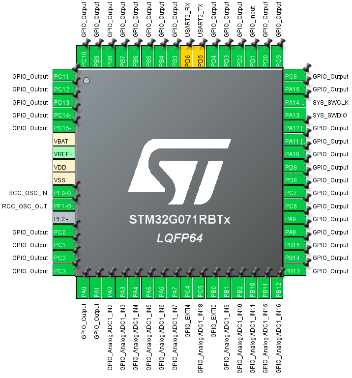 W projekcie zostały użyte wszystkie piny procesora, spełniając następujące funkcje: