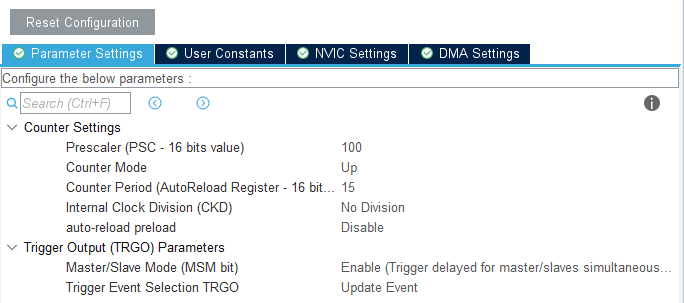 - Konfiguracja Timera 3, który wykorzystywany jest do wyzwalania konwersji przetwornika analogowo-cyfrowego oraz w przerwaniu od tego timera wykonywane są główne funkcje programu, generujące m.in. sygnał PWM.