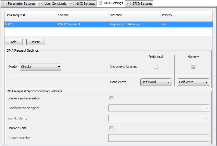 Po skonfigurowaniu ADC współpracującego z DMA w sposób przedstawiony na Rys. 1 pomiar się nie uruchamiał.