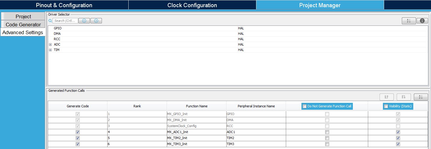 Przyczyną, dlaczego DMA nie działało, był błąd w inicjalizacji peryferiów. Żeby DMA działało poprawnie, musi być zainicjalizowane jako drugie w kolejności. Kolejność inicjalizacji można sprawdzić w CubeIDE w zakładce Project Manager –> Advanced Settings.