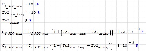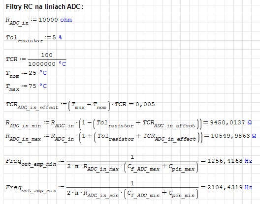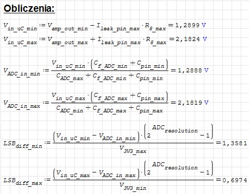 Z obliczeń wynika, że błąd wynikający z przeładowania wewnętrznej pojemności próbkującej za pomocą kondensatora 10nF w najgorszym przypadku wynosi 1LSB, więc dużo mniej niż błąd przetwornika (6.5LSB). Kondensator 10nF jest poprawną wartością.